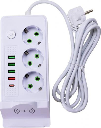 Tendenza Сетевой фильтр с заземлением на 3 розетки, 3 USB + 1 USB быстрая зарядка,1 Type-C быстрая зарядка и беспроводной зарядкой TZ-SP004